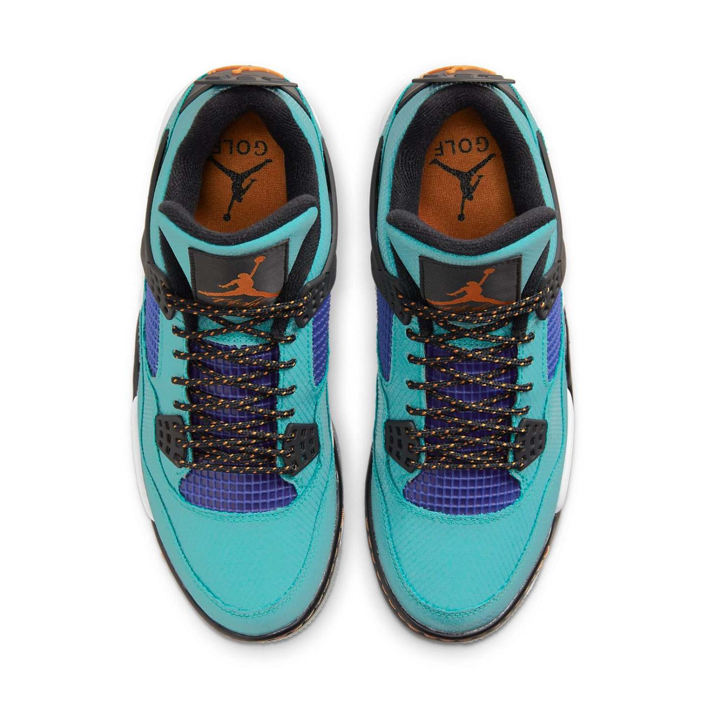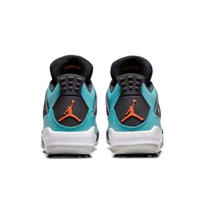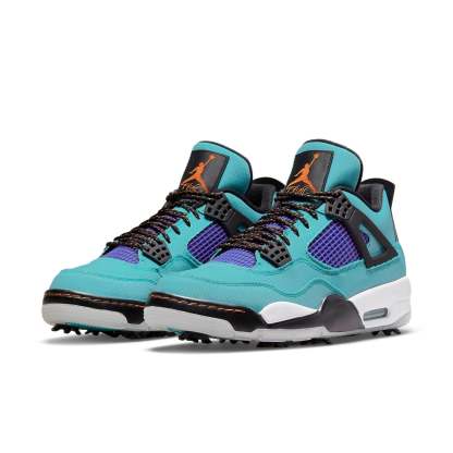 The Air Jordan 4 Golf NRG 'Torrey Pines' is a versatile and stylish shoe that is perfect for hitting the links or just strolling around town. The water-resistant textile upper is durable and good-looking, while the purple netting adds a touch of style. The Jumpman branding on the tongue and heel is a nice finishing touch. The midsole hearkens back to the original 1989 design, while the outsole is engineered for the fairway, with a full-length plate and removable spikes. This shoe is sure to keep you looking good and feeling comfortable all day long.